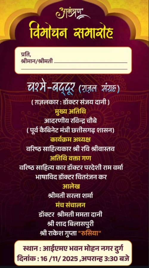 ‘जिला हिंदी साहित्य समिति’ के तत्वावधान में दुर्ग शहर के कान नाक गला विशेषज्ञ व ‘दुर्ग जिला हिंदी साहित्य समिति’ के पूर्व अध्यक्ष डॉ. संजय दानी के तीसरे ग़ज़ल संग्रह ‘चश्मेबद्दूर’ का विमोचन 16 नवम्बर, 2025 को अपराह्न 3.30 बजे दुर्ग [आई एमए भवन, मोहन नगर] में होगा.