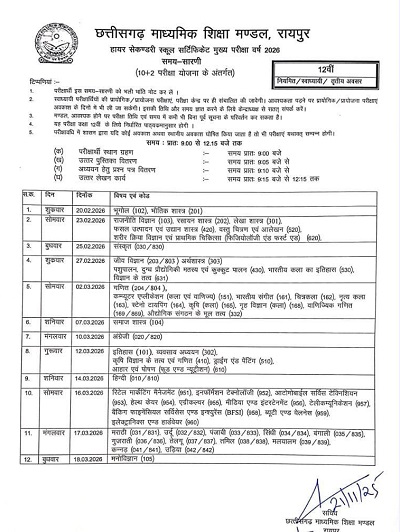 बोर्ड सचिव पुष्पा साहू ने बताया कि 12वीं बोर्ड परीक्षा 20 फरवरी 2026 से शुरू होकर 18 मार्च 2026 तक चलेगी।