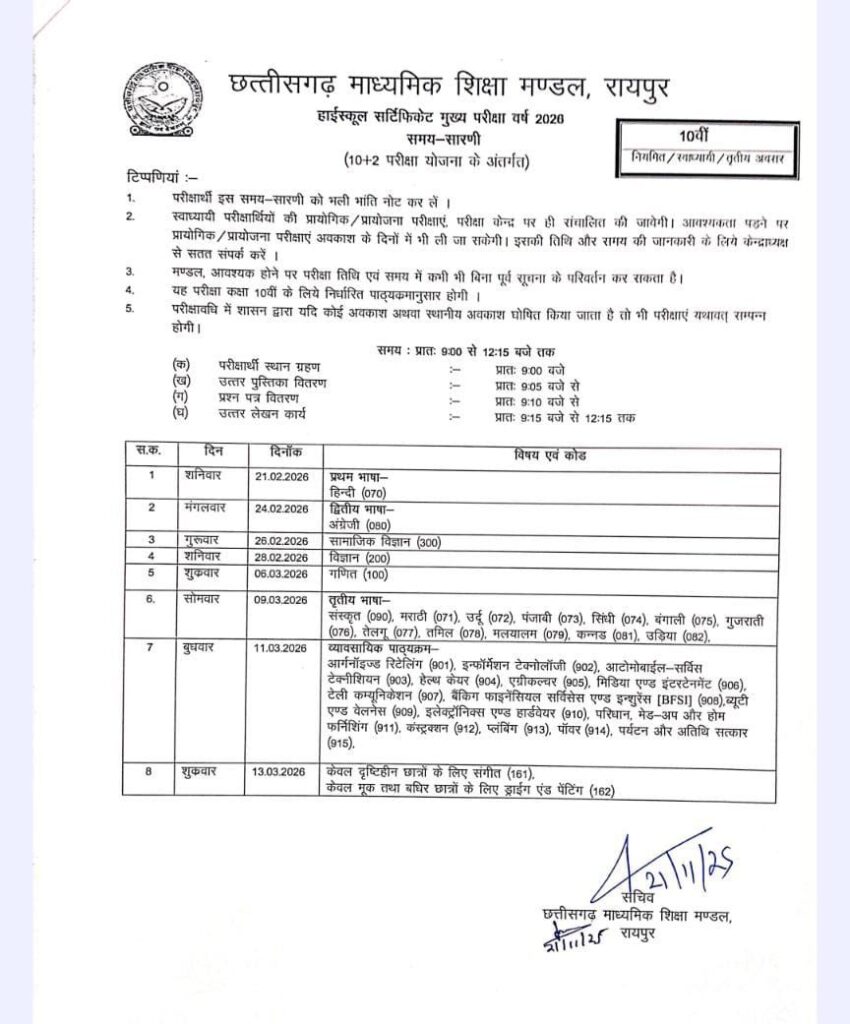 रायपुर। छत्तीसगढ़ के लाखों विद्यार्थियों के लिए बड़ी खबर सामने आई है। छत्तीसगढ़ माध्यमिक शिक्षा मंडल (CGBSE) ने नए साल से पहले ही 10वीं और 12वीं बोर्ड परीक्षाओं की आधिकारिक समय सारणी जारी कर दी है। इस बार विद्यार्थी पहले से अपनी तैयारी की योजना बना सकेंगे, क्योंकि बोर्ड ने परीक्षा तिथियां समय रहते घोषित कर दी हैं।