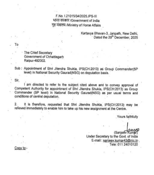 • IPS जितेंद्र शुक्ला NSG में ग्रुप कमांडर नियुक्त, तत्काल रिलीव करने केंद्रीय गृह मंत्रालय ने राज्य सरकार को भेजा पत्र
