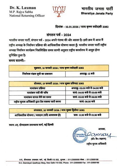 - बीजेपी राष्ट्रीय अध्यक्ष चुनाव को लेकर अधिसूचना जारी, 19 को नामांकन और 20 जनवरी को नितिन नबीन की ताजपोशी