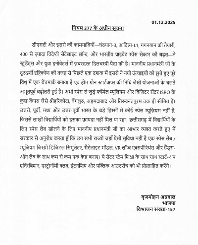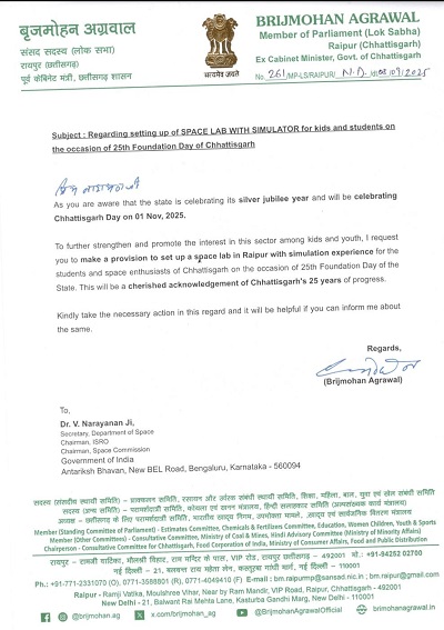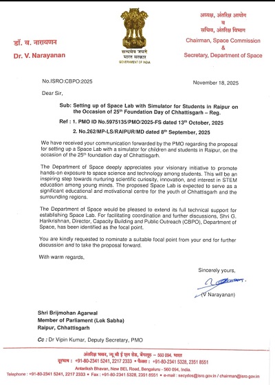 जिसके बाद 18 नवंबर 2025 को अंतरिक्ष विभाग के सचिव डॉ. वी. नारायणन ने सांसद बृजमोहन अग्रवाल को पत्र के माध्यम से रायपुर में सिम्युलेटर सहित एक अंतरिक्ष प्रयोगशाला स्थापित करने की स्वीकृति प्रदान करने की जानकारी दी थी।