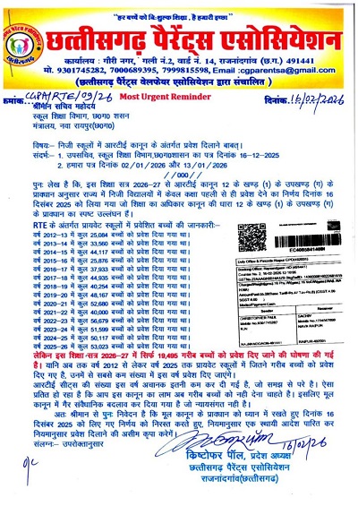 • RTE में बदलाव को लेकर पैरेंट्स एसोसिएशन ने शिक्षा विभाग पर लगाए गंभीर आरोप, कहा- गरीब बच्चों से छीना जा रहा अधिकार, 53 हजार से सीधे 19 हजार पर सिमटी सीटें