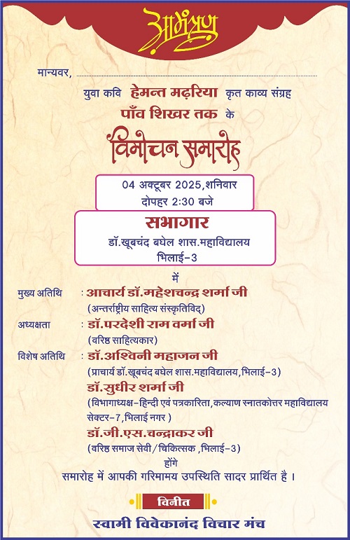 - विमोचन समारोह : युवा कवि हेमंत मढ़रिया कृत काव्य संग्रह ‘पांव शिखर तक’ का विमोचन 04 अक्टूबर, 2025 को दोपहर 2.30 बजे : डॉ. खुबचंद बघेल शासकीय महाविद्यालय भिलाई-3 में