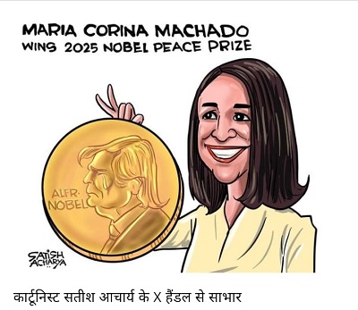 अभी उसने झटपट गाजा पट्टी के लिए बीस सूत्रीय शांति योजना संपन्न करवाई थी कि इसके बाद तो कोई ताकत उसे रोक नहीं पाएगी। मोदी जी ने इस सफलता के लिए अपने ‘दोस्त ‘ ट्रंप को बधाई भी दी थी, मगर सब व्यर्थ गया। दिन-रात की ‘मेहनत’ भैंस की तरह पानी में गई और यह पुरस्कार ले गईं वेनेजुएला की मारिया कोरिना मकाओ! कोई बात है भला!