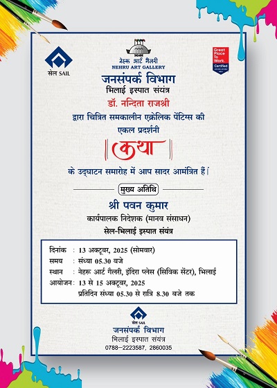 एकल चित्रकला प्रदर्शनी का उद्घाटन 13 अक्टूबर, 2025 को संध्याकाल 5.30 भिलाई इस्पात संयंत्र के कार्यपालक निदेशक {मानव संसाधन} पवन कुमार के मुख्य अतिथि में किया जायेगा.