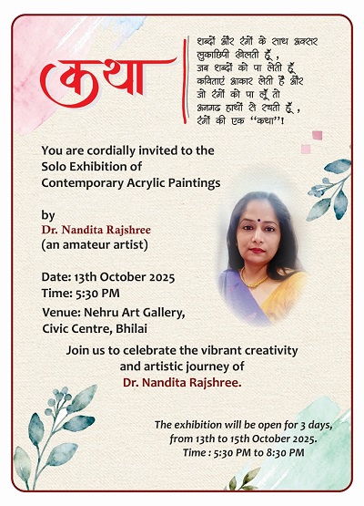 • एकल चित्रकला प्रदर्शनी : डॉ. नंदिता राजश्री की चित्रकला प्रदर्शनी ‘कथा’ का उद्घाटन 13 अक्टूबर, 2025 को शाम 5.30 बजे भिलाई इस्पात संयंत्र के कार्यपालक निदेशक पवन कुमार करेंगे : डॉ. नंदिता राजश्री समकालीन कला के क्षेत्र में सक्रिय हैं. कवयित्री राजश्री अपने चित्रों में शब्दों और रंगों के माध्यम से भावनाओं को जीवंत रूप देती हैं