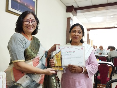 👉 [द्वितीय चित्र] बानी चक्रवर्ती का पुष्पमाला पहनाकर स्वागत करती हुई सोमाली शर्मा