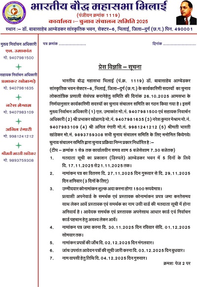 भारतीय बौद्ध महासभा भिलाई : चुनाव की घोषणा, 17 नवम्बर 2025 को जारी होगी मतदाता सूची : मुख्य चुनाव अधिकारी एल. उमाकांत एवं सहायक निर्वाचन अधिकारी प्रभाकर खोब्रागड़े, नरेश कुमार मेश्राम, अनिल रंगारी, भारती खांडेकर बनाए गए : मतदान 14 दिसम्बर को