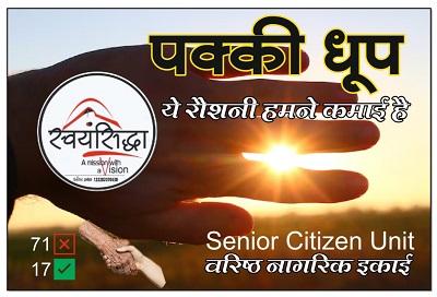 ‘पक्की धूप’ : जिसमें वरिष्ठ नागरिकों के अनुभवों को स्वर दिया जाएगा जिससे नई पीढ़ी को लाभ पहुंचे एवं उनकी प्रतिभा को भी मंच प्राप्त हो।उल्लेखनीय है कि स्वयंसिद्धा की “कच्ची धूप” नामक इकाई श्रमिक बस्ती के बच्चों के लिए काम करती है।