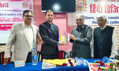 लेखक व पत्रकार मुहम्मद जाकिर हुसैन ने हिंदी के वैश्विक परिवेश में भारतवंशियों के दुनिया भर में प्रवास और हिंदी फिल्मों की भूमिका पर विस्तार से जानकारी दी। वहीं लेखक बद्री प्रसाद पारकर ने हिंदी के वैश्विक स्वरूप पर चर्चा की। इस अवसर पर संस्कृत के विद्वान और पूर्व प्राचार्य डॉ महेश चंद्र शर्मा ने अपनी पुस्तकों का एक सेट प्राचार्य डॉ. विनय शर्मा और हिंदी सेवी मयंक जैन को सौंपा।