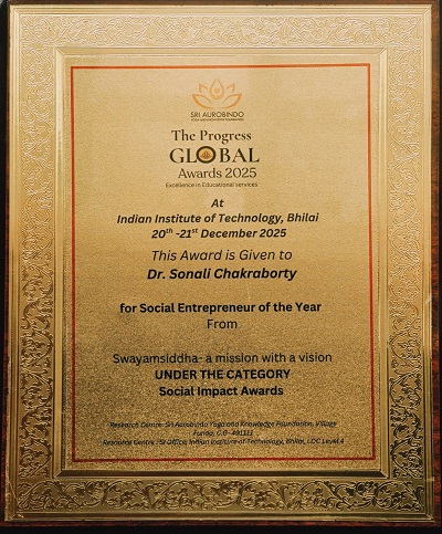 आईआईटी भिलाई में आयोजित सस्टेनेबल इंडिया के दो दिवसीय अंतरराष्ट्रीय कार्यक्रम में देश विदेश से आए विद्वानों व वक्ताओं के साथ छत्तीसगढ़ के शिक्षा मंत्री गजेंद्र यादव ने उल्लेखनीय सामाजिक प्रभाव के लिए डॉ.सोनाली चक्रवर्ती को ग्लोबल प्रोग्रेस अवार्ड के तहत यह सम्मान प्रदान किया। ज्ञातव्य हो कि डॉ.सोनाली चक्रवर्ती गत 25 वर्षों से छत्तीसगढ़ में महिला एवं बाल विकास, स्वच्छता, पर्यावरण, नशा मुक्ति के क्षेत्र में सराहनीय कार्य कर रही है व समाज को एक सकारात्मक बदलाव देने के लिए प्रयासरत है।