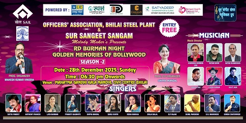 सांगीतिक संस्था ‘सुर संगीत संगम मेलोडी मेकर्स’ एवं ‘ऑफिसर्स एसोसिएशन भिलाई इस्पात संयंत्र’ के तत्वावधान में 28 दिसम्बर, 2025 को ‘महात्मा गाँधी कला मंदिर’ सिविक सेंटर भिलाई में स्व. आरडी बर्मन के सुपर हिट नग़्मों का भव्य सांगीतिक संध्या शाम 6.30 बजे से आयोजित किया गया है.