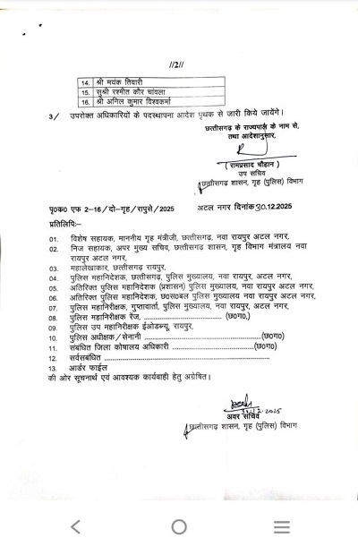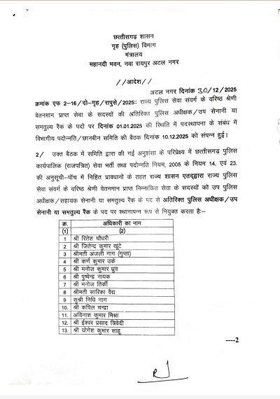 गृह (पुलिस) विभाग द्वारा विभागीय पदोन्नति एवं छानबीन समिति की अनुशंसा के आधार पर राज्य पुलिस सेवा संवर्ग के वरिष्ठ श्रेणी वेतनमान प्राप्त 16 अधिकारियों को उप पुलिस अधीक्षक/सहायक सेनानी या समतुल्य रैंक के पद से अतिरिक्त पुलिस अधीक्षक/उप सेनानी या समतुल्य रैंक के पद पर स्थानापन्न रूप से पदोन्नत किया गया है. पदोन्नत अधिकारियों में रितेश चौधरी, जितेन्द्र कुमार खूंटे, मती अंजली नाग (गुप्ता), कर्ण कुमार उके, मनोज कुमार ध्रुव, पुष्पेन्द्र नायक, मनोज तिर्की, मती सारिका वैद्य, सु निधि नाग, कपिल चन्द्रा, अविनाश कुमार मिश्रा, ईश्वर प्रसाद त्रिवेदी, योगेश कुमार साहू, मयंक तिवारी, सु रश्मीत कौर चांवला तथा अनिल कुमार विश्वकर्मा शामिल हैं.