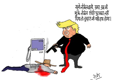 03 जनवरी, 2026 की सरकार ने काराकास, वेनेज़ुएला और इस देश के तीन राज्यों पर बड़ा हमला किया। लगभग 150 विमान आसमान में उड़ रहे थे और बहुत तेज़ी से बमबारी कर रहे थे। इन विमानों में ईए-18 ग्रोलर्स थे, जो अगली पीढ़ी के जैमर्स जैसे सबसे उन्नत इलेक्ट्रॉनिक युद्ध प्रणालियों से लैस थे, साथ ही एएच-64 अपाचे और सीएच-47 चिनूक हेलीकॉप्टर भी थे। शहर के लोगों ने इतनी अंधाधुंध हिंसा कभी नहीं देखी थी : ज़ोरदार धमाके, धुएं का बड़ा गुबार, और विमान – जो प्रति-हमले से बेपरवाह लग रहे थे – ने शहर को अंधेरे में डुबो दिया। बाद में, एक पत्रकार वार्ता में, अमेरिकी राष्ट्रपति डोनाल्ड ट्रंप ने कहा, ‘हमारे पास जो खास विशेषज्ञता हैं, उसकी वजह से काराकास की लाइटें काफी हद तक बंद थीं। वहां अंधेरा था और यह जानलेवा था’। अमेरिका अपनी सेना पर हर साल 1 ट्रिलियन डॉलर से ज़्यादा खर्च नहीं करता, जबकि उसने दुनिया का सबसे खतरनाक हथियार बनाया है। यह हाइपर-इंपीरियलिज़्म (हमलावर-साम्राज्यवाद) का हाइपर-ड्राइव (घातक-अभियान) था.