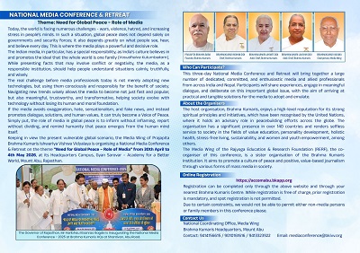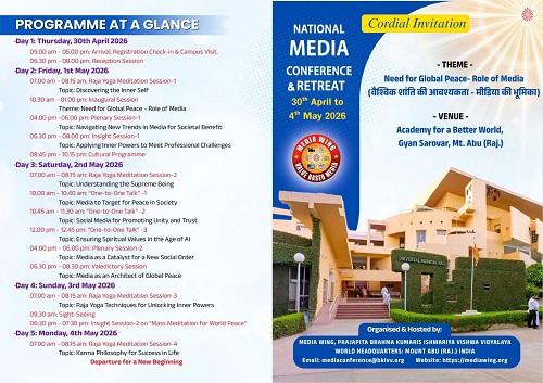 प्रति वर्ष की भाँति इस वर्ष भी “वैश्विक शांति की आवश्यकता-मीडिया की भूमिका”[Need for Global Peace Role of Media] विषय पर नेशनल मीडिया कॉंफ़्रेंस 30 अप्रैल से 04 मई, 2026 तक ज्ञानसरोवर माउंट आबू में होगा.