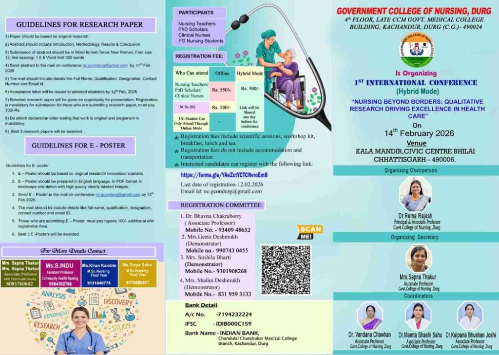 अंतर्राष्ट्रीय कान्फ्रेंस : शासकीय नर्सिंग कॉलेज के तत्वावधान में एक दिवसीय अंतर्राष्ट्रीय सम्मेलन 14 फरवरी, 2026 को : विषय है- ‘सीमाओं से परे नर्सिंग : स्वास्थ्य सेवा में उत्कृष्टता लाने वाला गुणात्मक अनुसंधान’