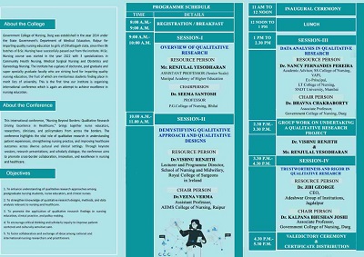 आयोजन की चेयरपर्सन और नर्सिंग कॉलेज की प्रिंसिपल डॉ. रीमा राजेश ने बताया कि दिन भर चलने वाली इस कान्फ्रेंस का विषय ‘सीमाओं से परे नर्सिंग: स्वास्थ्य सेवा में उत्कृष्टता लाने वाला गुणात्मक अनुसंधान’ रखा गया है। आयोजन सचिव सपना ठाकुर एसोसिएट प्रोफेसर गवर्नमेंट कॉलेज ऑफ़ नर्सिंग दुर्ग, समन्वयक डॉ. वंदना चौहान एसोसिएट प्रोफेसर गवर्नमेंट कॉलेज ऑफ़ नर्सिंग दुर्ग,डॉ. ममता शशि साहू एसोसिएट प्रोफेसर गवर्नमेंट कॉलेज ऑफ़ नर्सिंग, दुर्ग,डॉ. कल्पना भूषण जोशी एसोसिएट प्रोफेसर गवर्नमेंट कॉलेज ऑफ़ नर्सिंग दुर्ग तैयारियों में जुटे हैं।