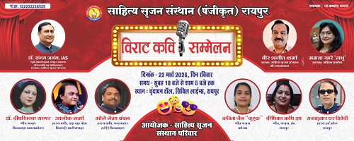 साहित्य सृजन संस्थान द्वारा लगातार जारी 43 वीं मासिक काव्य संध्या,को विराट कवि सम्मेलन के रूप में दिनांक 22,मार्च,2026 दिन रविवार को सुबह 10 बजे से शाम 5 बजे तक वृंदावन हॉल सिविल लाइन्स में आयोजित किया जा रहा है।जिसमें राष्ट्रीय कवियों दीपशिखा सागर,छिंदवाड़ा, कविता जैन कुहुक कोरबा,भोले नेमा चंचल छिंदवाड़ा,आलोक शर्मा,भिलाई,दीपिका ऋषि झा एवं कवि राजकुमार धर द्विवेदी हिस्सा लेंगे।
